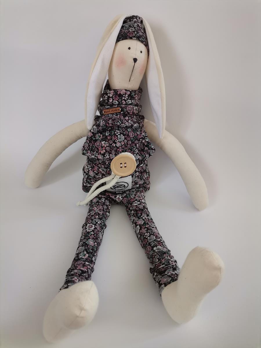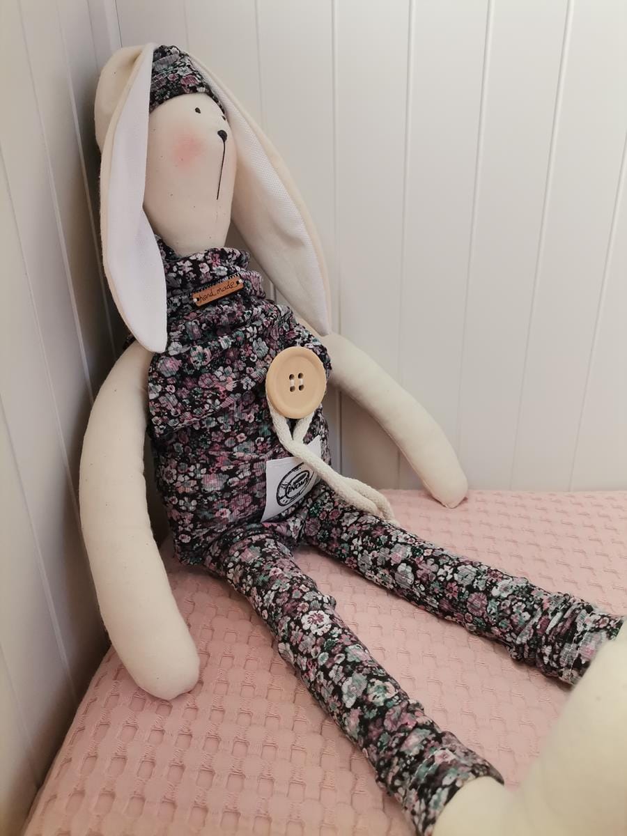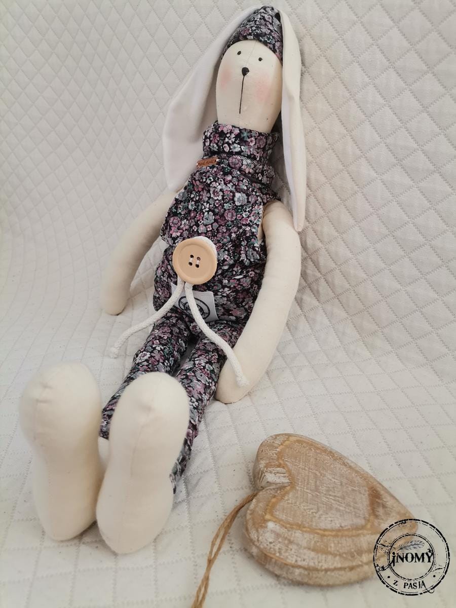 Zajączek ubrany w kwiecisty kombinezon z rozciągliwego materiału z drewnianym guzikiem oraz opaskę.