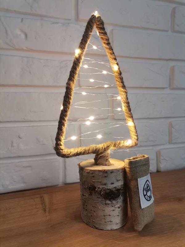 Choineczka na brzozowym pieńku. Szkielet choinki wykonany z drutu opleciony jutową linką.
