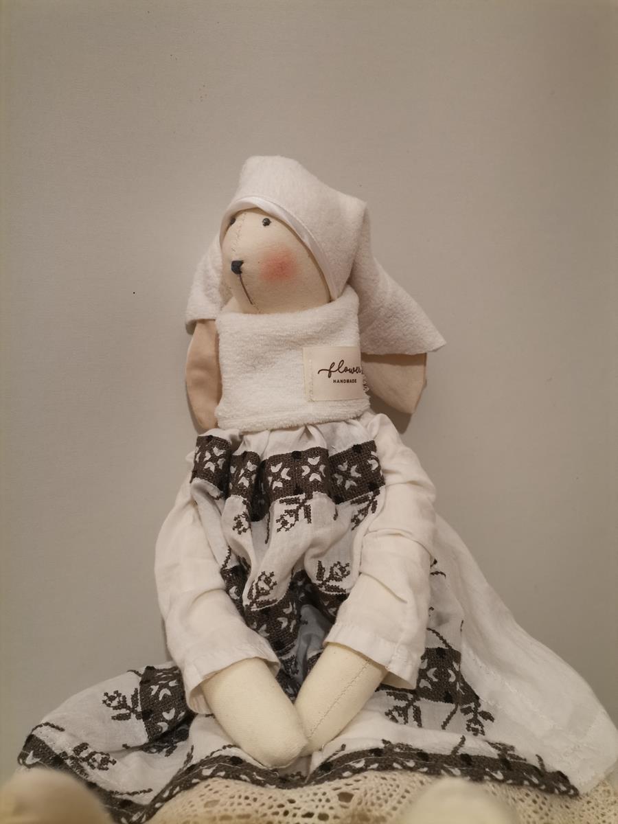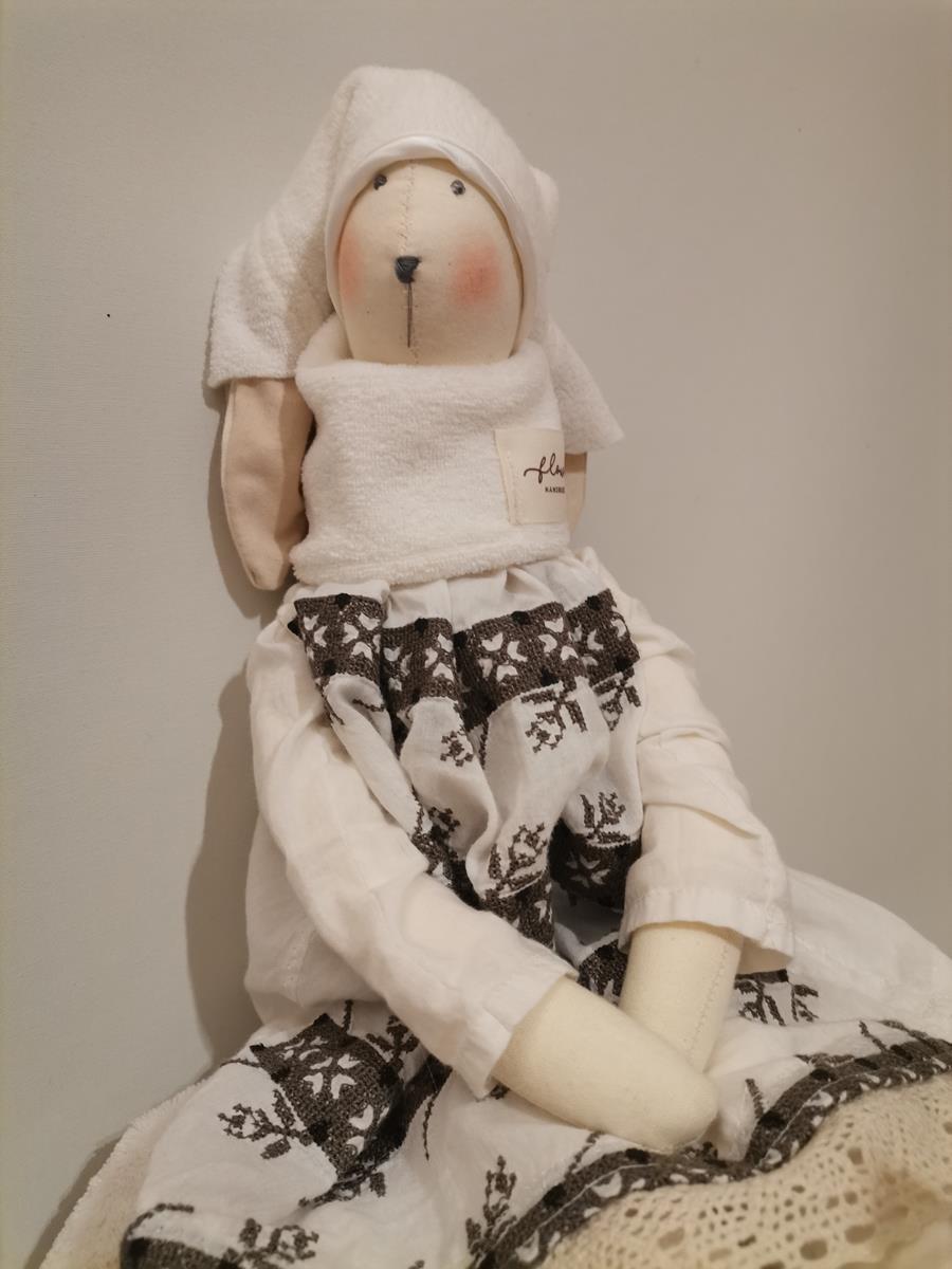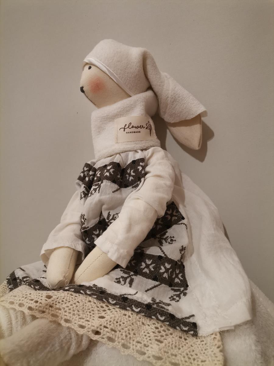 Zajączek ubrany jest w białą sukienkę z haftem wykończoną koronką, polarowy komin i hustę.