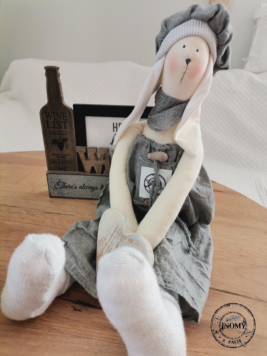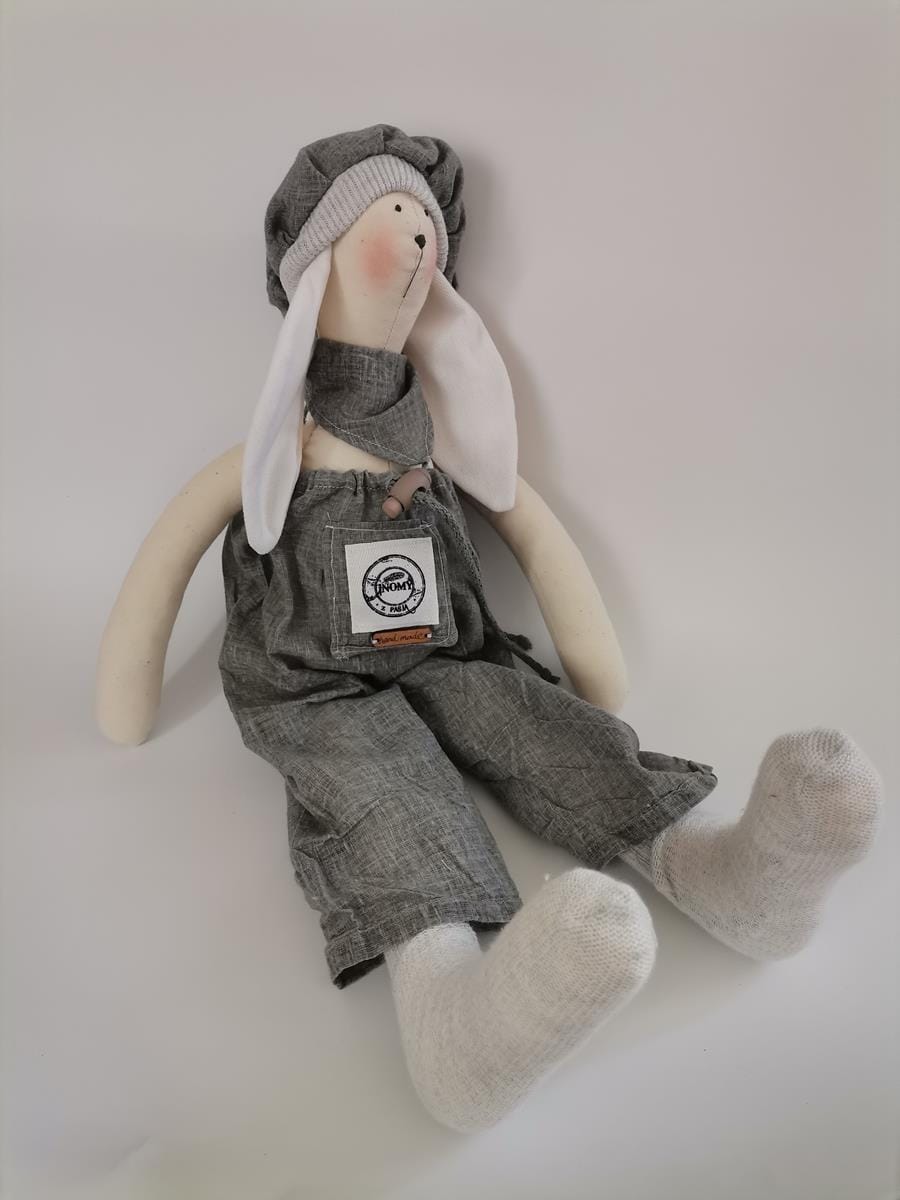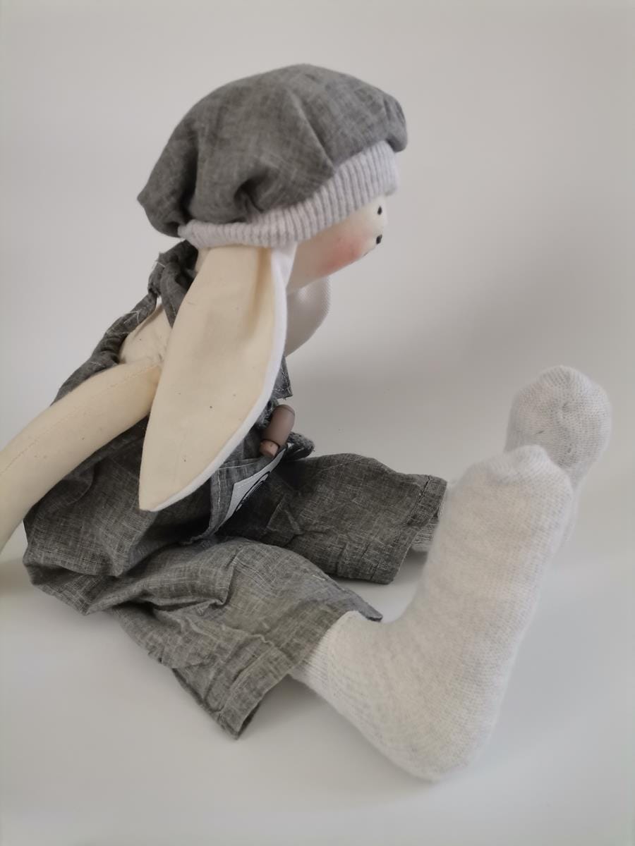 Zajączek ubrany jest w szerokie wysokie spodenki ściągnięte sznureczkiem, bawełniane skarpetki, berecik i apaszkę w kolorze khaki.
