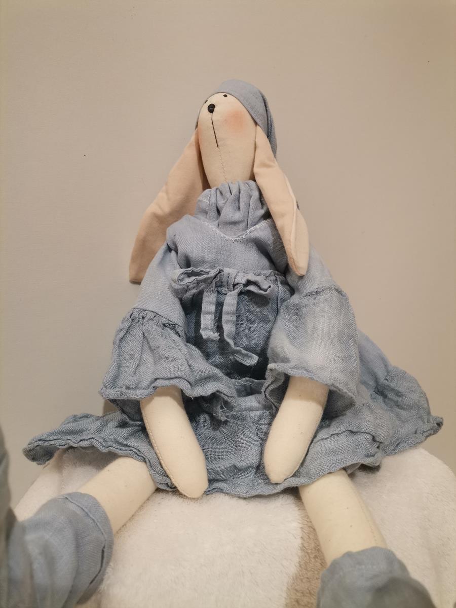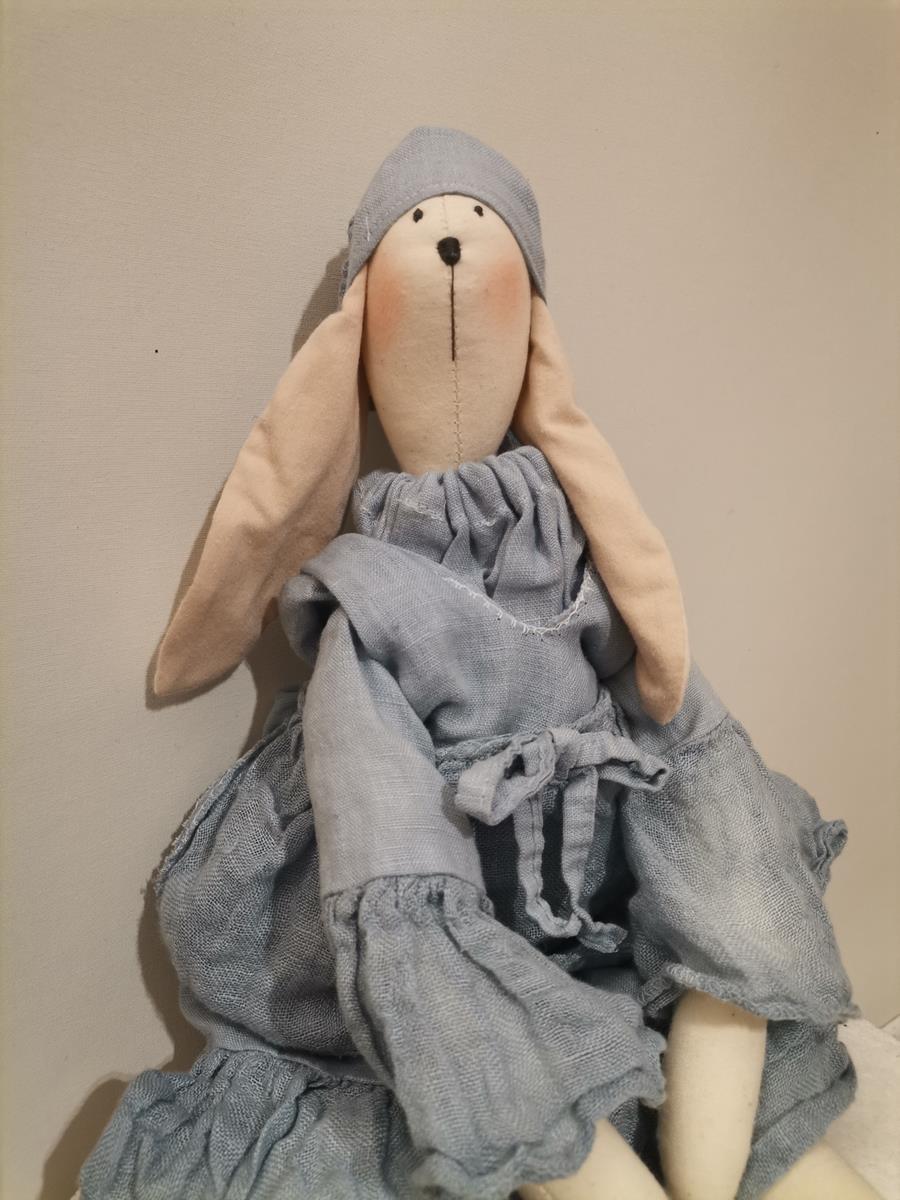 Zajączek ubrany jest w lnianą błękitną sukienkę, fartuszek, chusteczkę oraz skarpety.