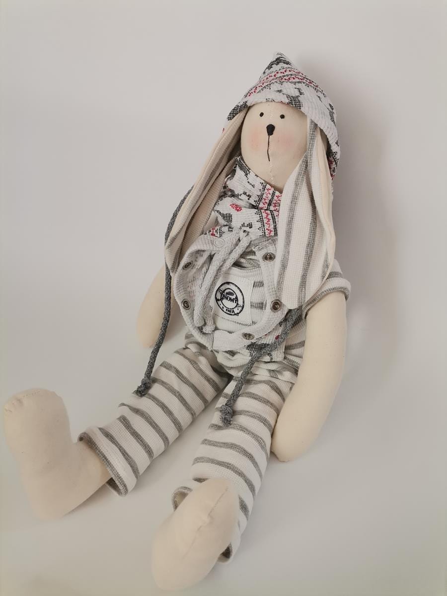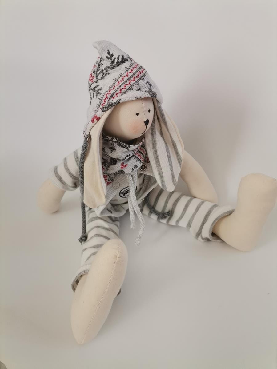 Zajączek ubrany jest w kombinezon w biało-szare paseczki, czapeczkę świąteczną w śnieżynki i reniferki z bawełnianymi sznureczkami oraz komin.